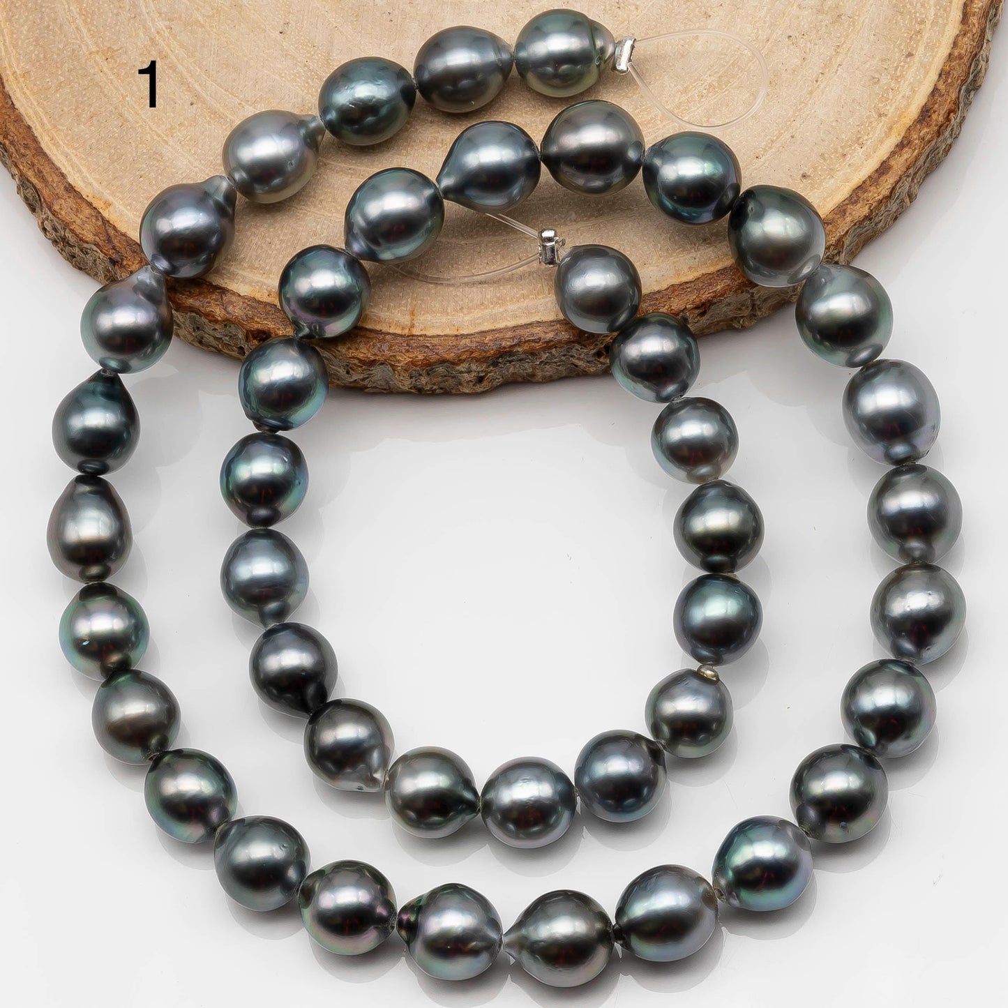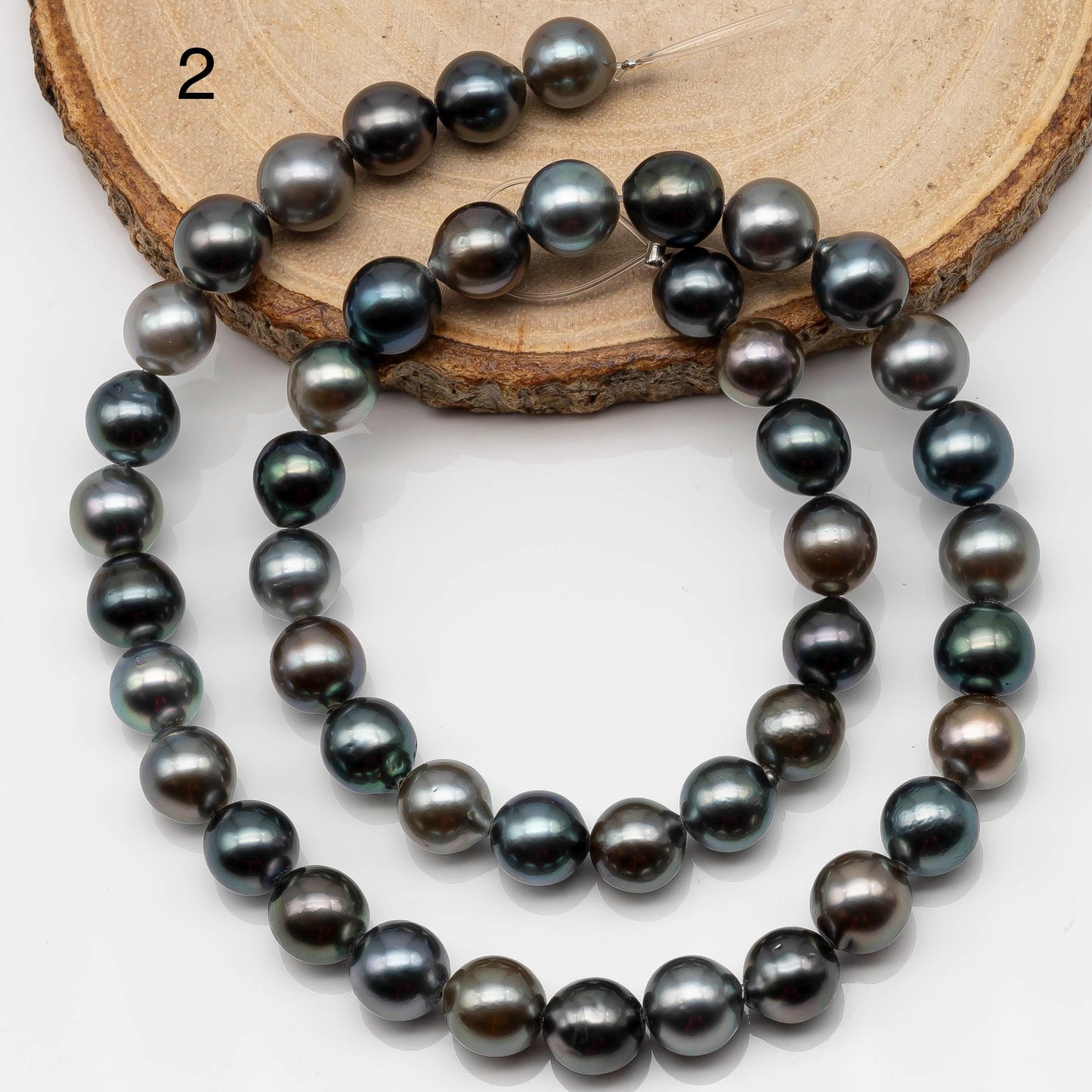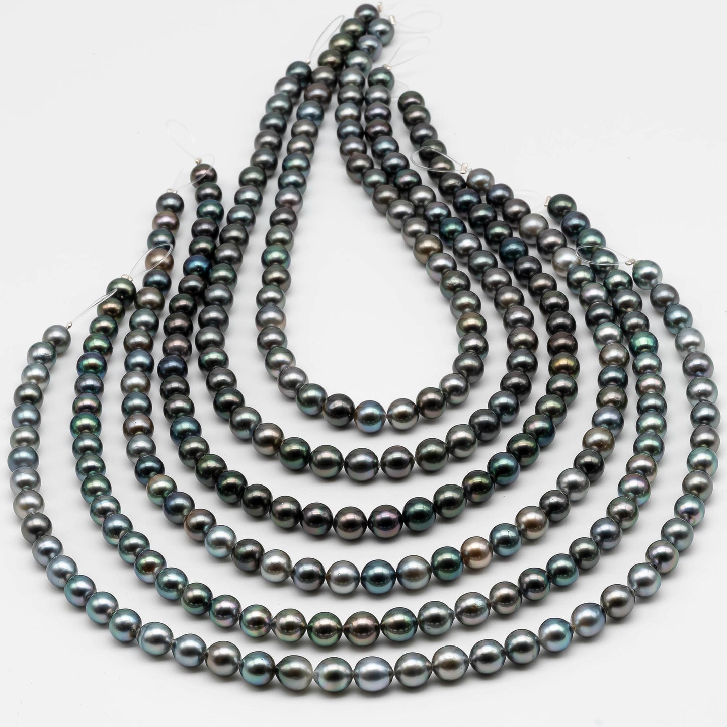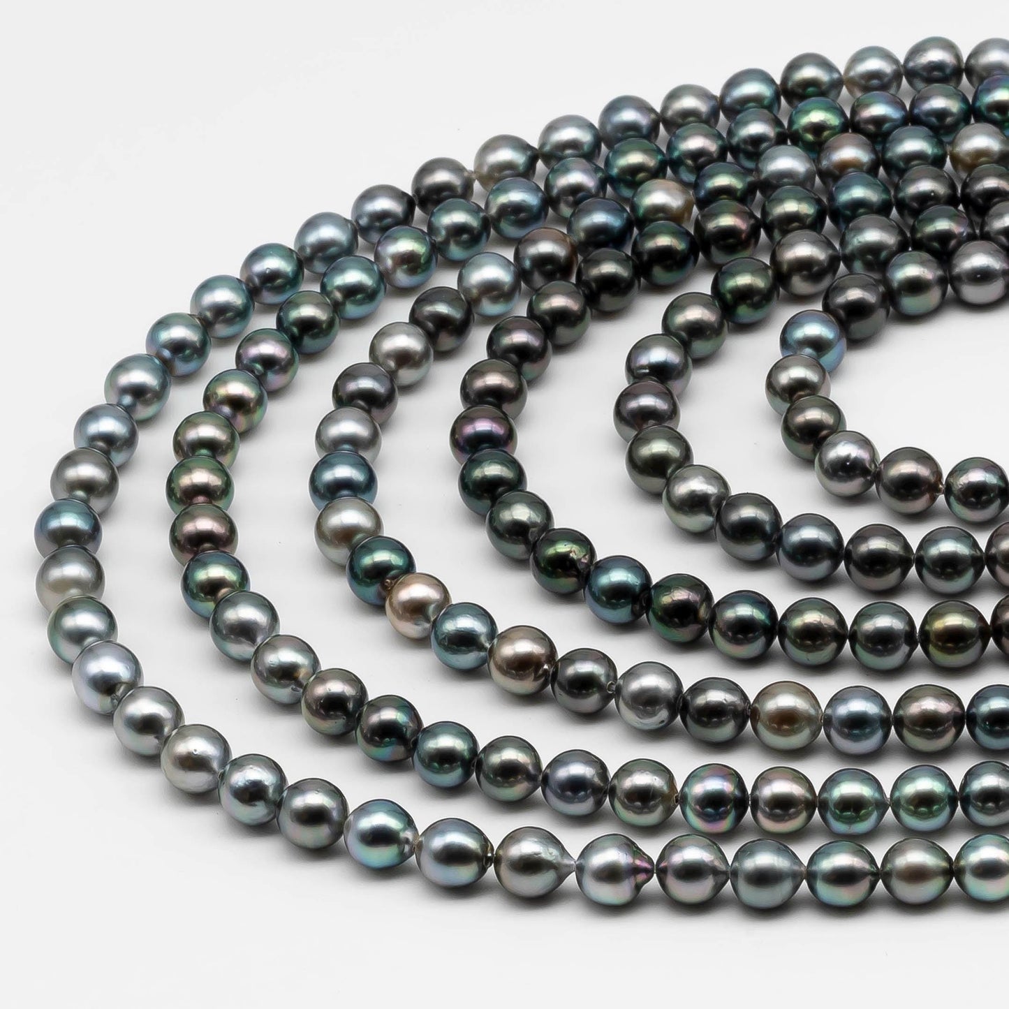 Tahitian Pearl in full strand for beading or jewelry making. These are beautiful pearls with lusters and blemishes. Tahitian pearls are referred as black pearls, but they come in different tones of natural colors. The colors are peacock, green, blue, black, grey, or light grey.
