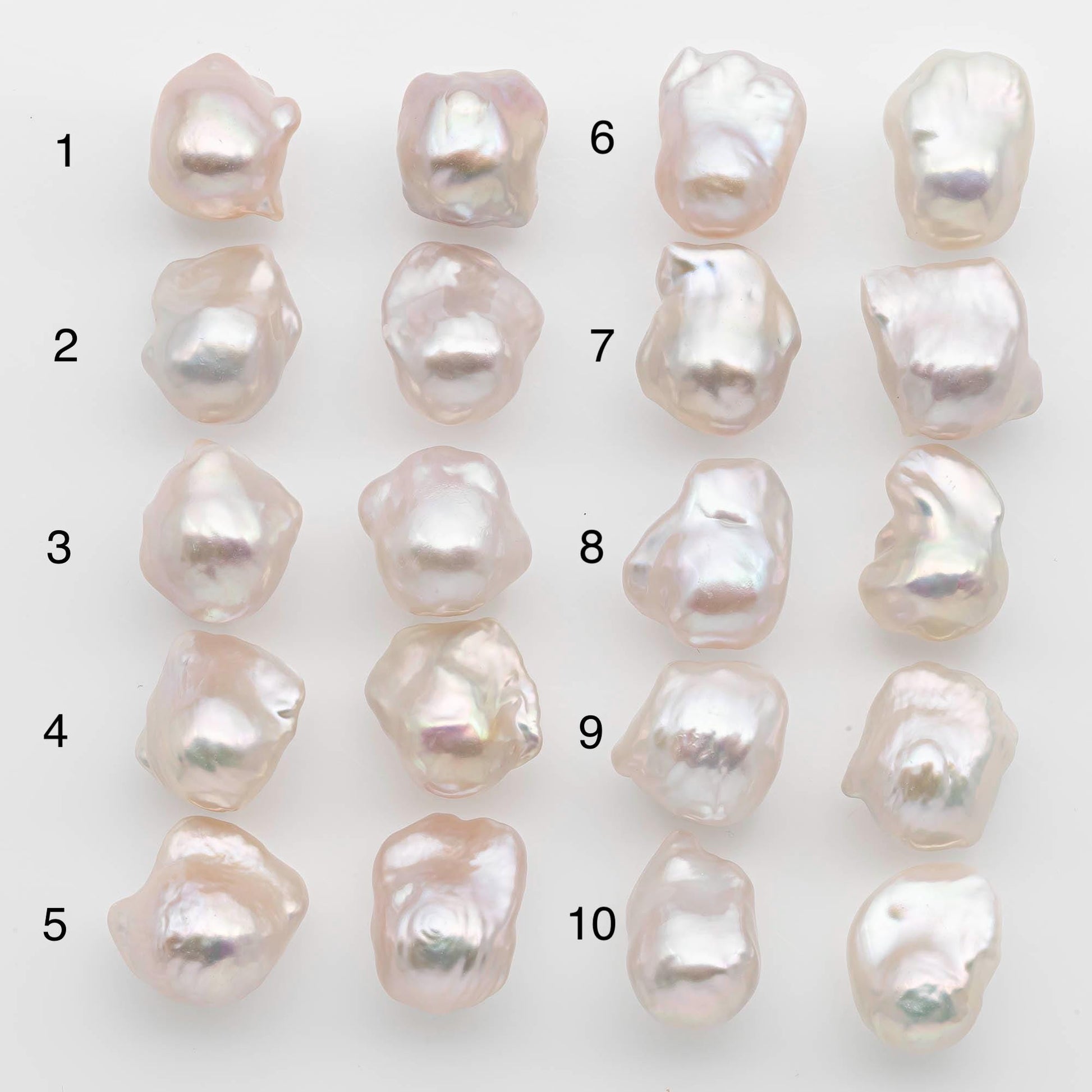 These are small size freshwater baroque pearls sold as a matching set. They are high-quality pairs with smooth surfaces on both the front and back. Some may have minor natural blemishes, which are part of the pearl’s unique beauty and cannot be completely avoided.