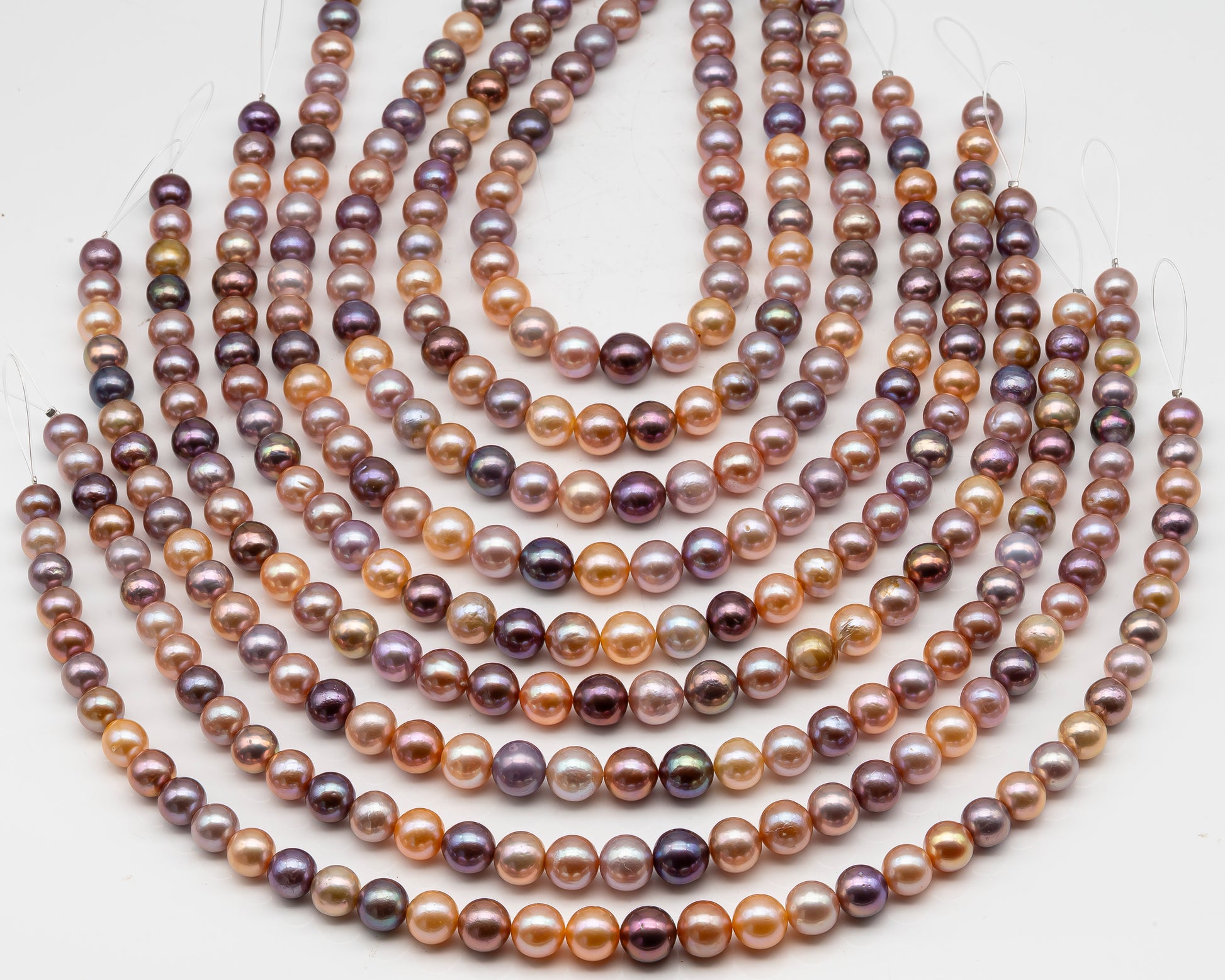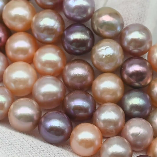 Beautiful freshwater Edison pearls temporarily strung in a full strand, ready for your custom jewelry designs. These stunning pearls feature white colors with high luster. The strand is strung graduated, meaning the pearls start smaller at each end and gradually increase to the largest size in the middle, then decrease back down to smaller pearls at the other end. Perfect for creating necklaces, bracelets, earrings, or any jewelry design you prefer.