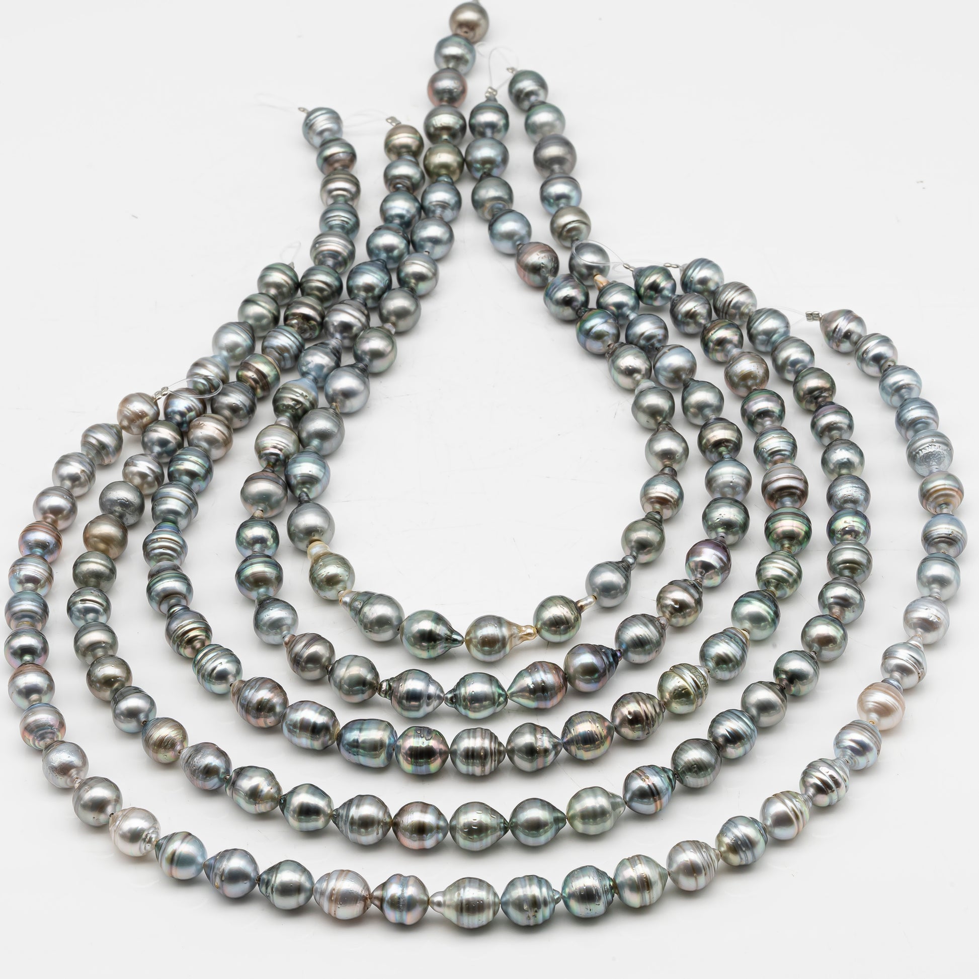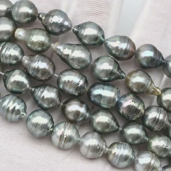 Tahitian pearls temporarily strung in full strands, perfect for restringing and knotting to make a beautiful necklace or breaking up to create your own jewelry designs. These gems feature high luster with natural blemishes on the surface and beautiful natural colors.