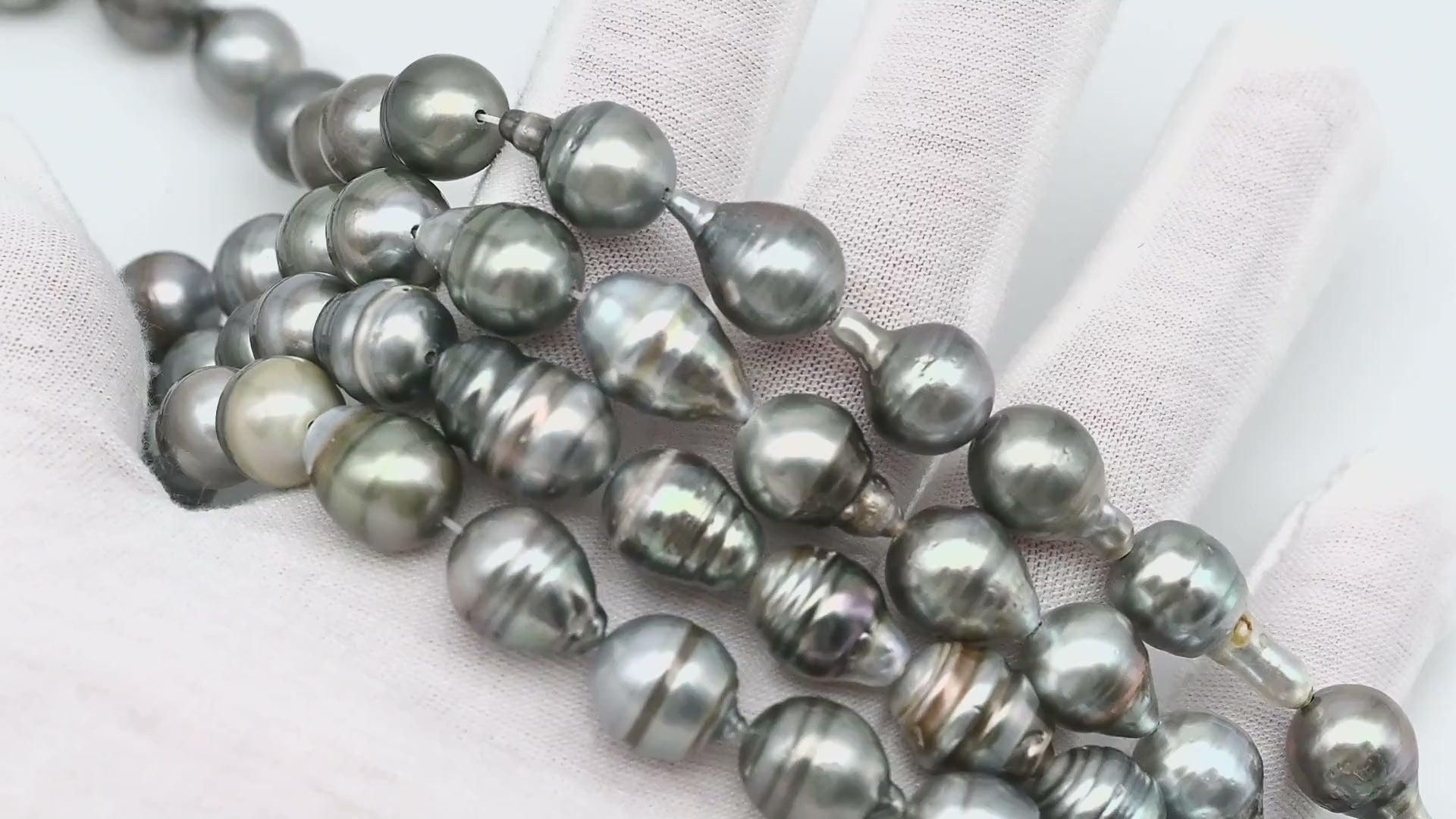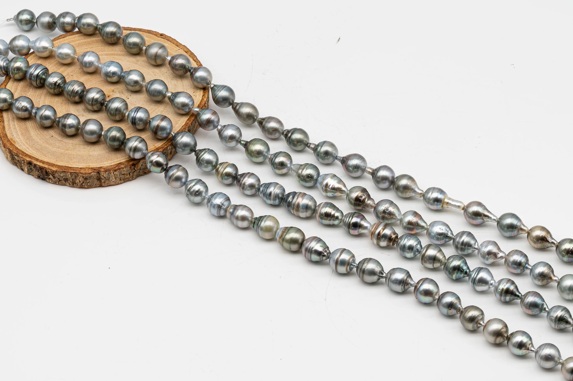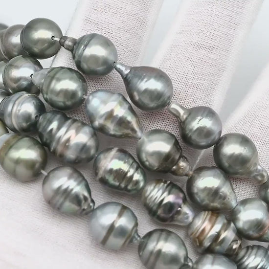 Tahitian pearls temporarily strung in full strands, perfect for restringing and knotting to make a beautiful necklace or breaking up to create your own jewelry designs. These gems feature high luster with natural blemishes on the surface and beautiful natural colors.