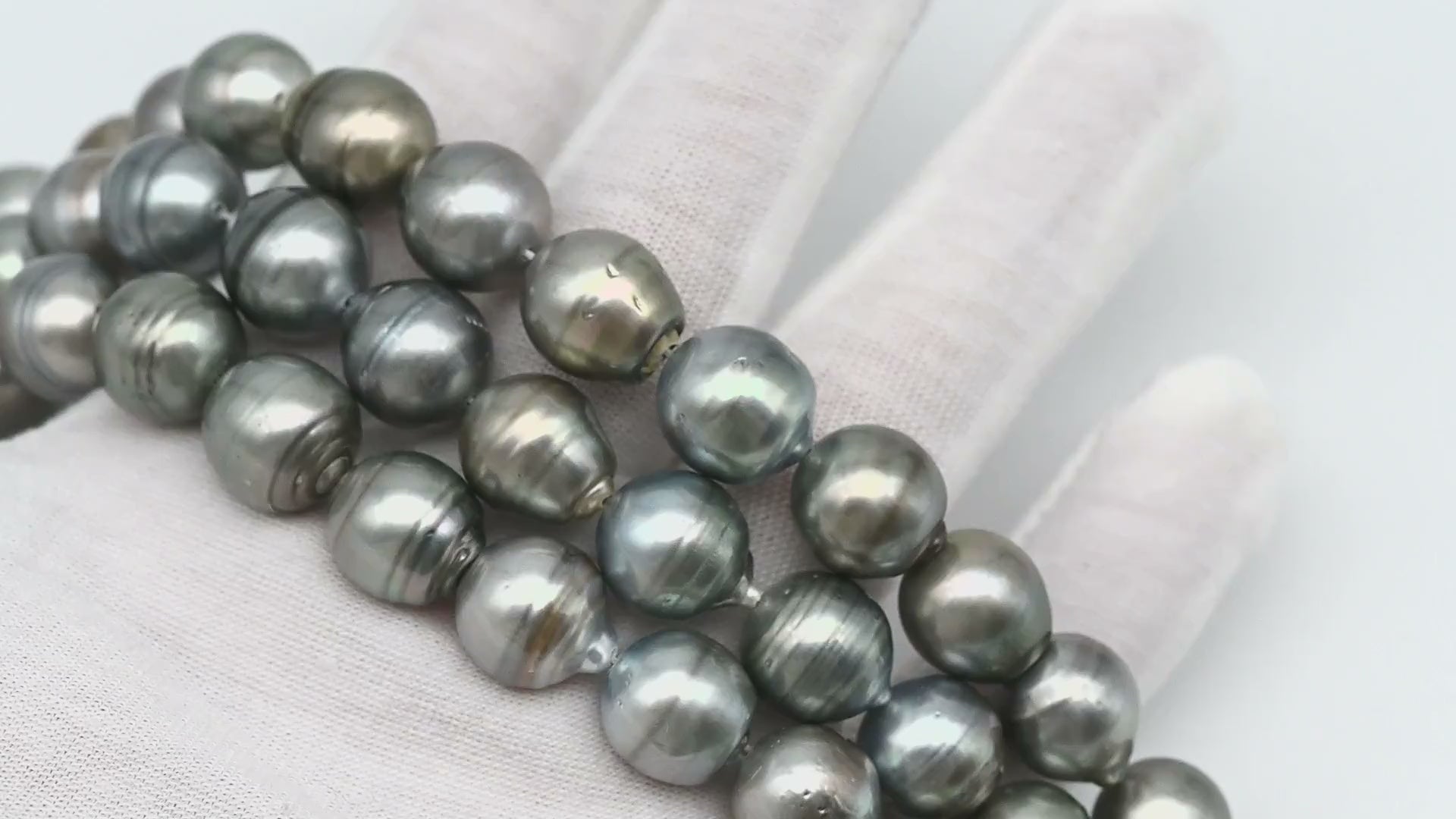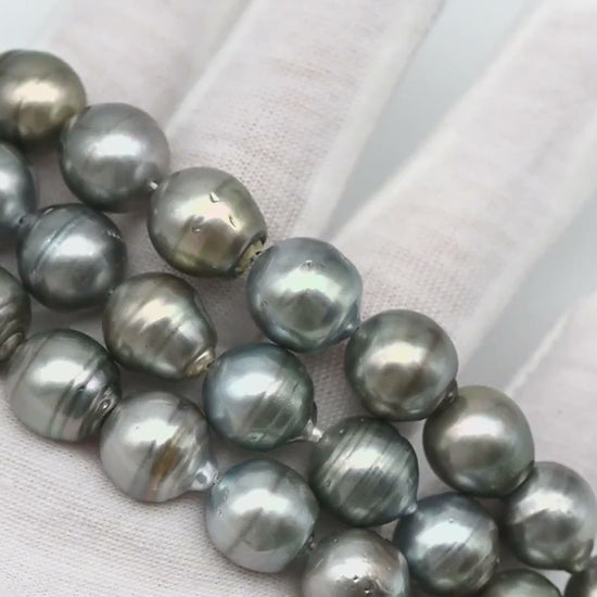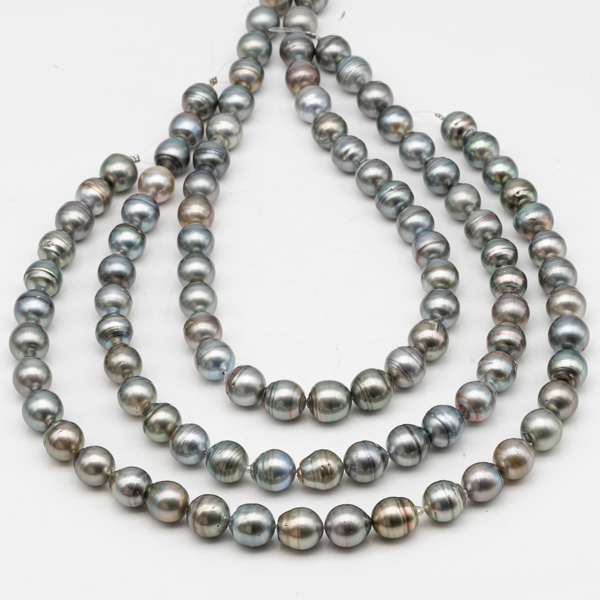 Tahitian pearls temporarily strung in full strands, perfect for restringing and knotting to make a beautiful necklace or breaking up to create your own jewelry designs. These gems feature high luster with natural blemishes on the surface and beautiful natural colors.