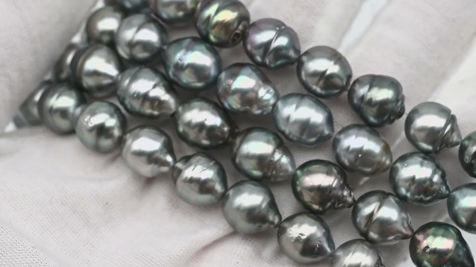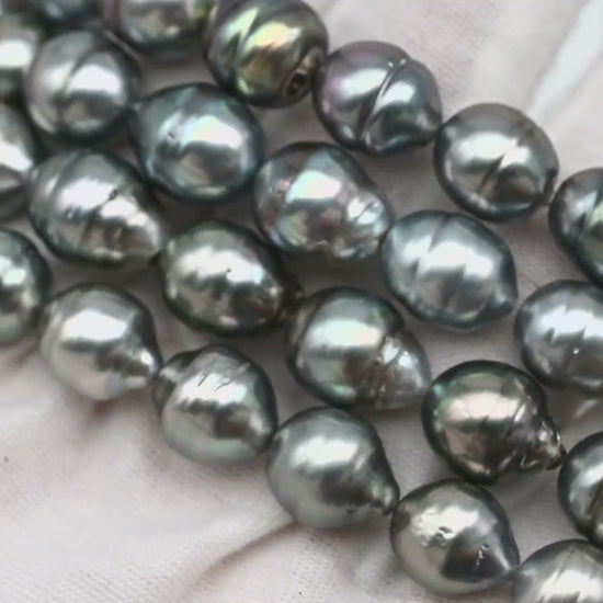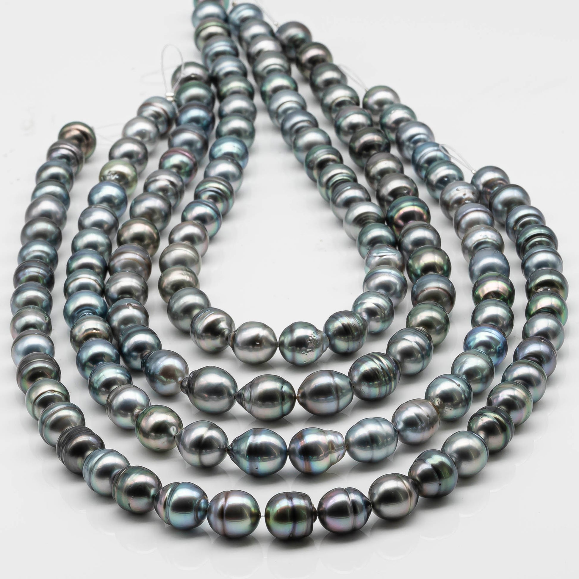 Tahitian Pearl in full strand for beading or jewelry making. These are beautiful pearls with lusters and blemishes. Tahitian pearls are referred as black pearls, but they come in different tones of natural colors. The colors are peacock, green, blue, black, grey, or light grey.