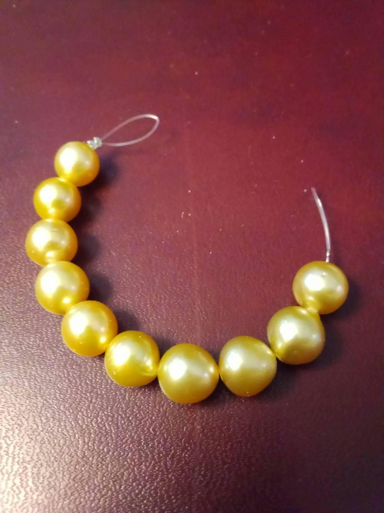 This is a short strand of 10–11mm Golden South Sea pearls, beautifully matched in near round shape with a glowing, all-natural golden body color. Each pearl has smooth surfaces with light to moderate natural marks, showing the organic character of genuine South Sea pearls. This strand is ideal for jewelry makers and designers who want to create elegant necklaces, bracelets, or earrings with a timeless luxury feel.