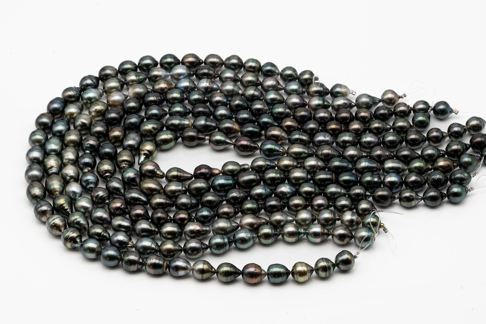 Tahitian pearls temporarily strung in full strands, perfect for restringing and knotting to make a beautiful necklace or breaking up to create your own jewelry designs. These gems feature high luster with natural blemishes on the surface and beautiful natural colors.