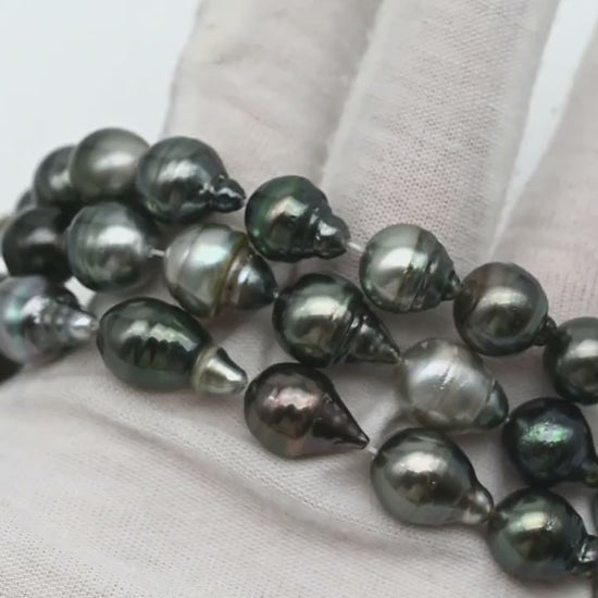 Tahitian pearls temporarily strung in full strands, perfect for restringing and knotting to make a beautiful necklace or breaking up to create your own jewelry designs. These gems feature high luster with natural blemishes on the surface and beautiful natural colors.
