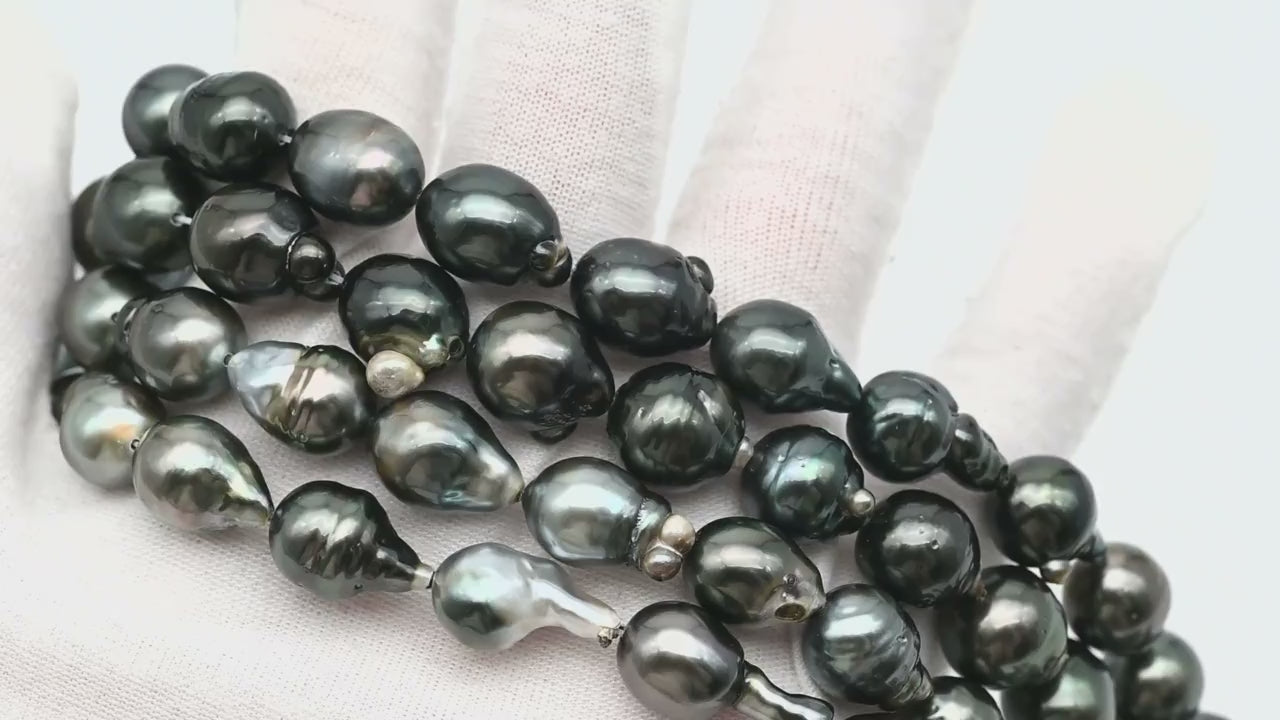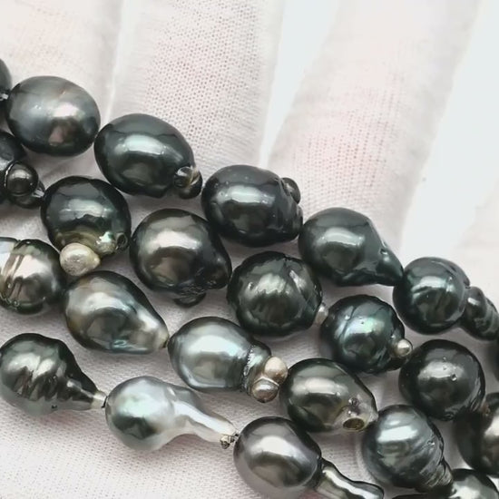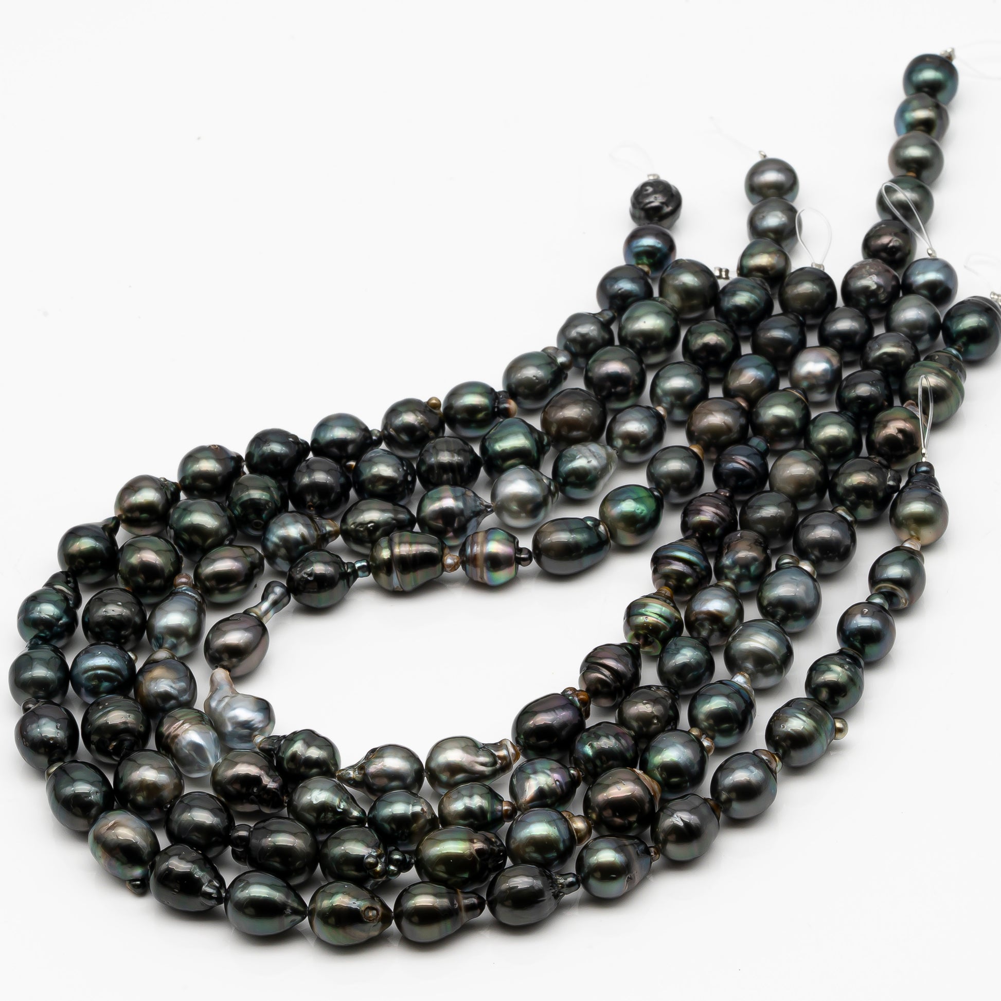 Tahitian pearls temporarily strung in full strands, perfect for restringing and knotting to make a beautiful necklace or breaking up to create your own jewelry designs. These gems feature high luster with natural blemishes on the surface and beautiful natural colors.