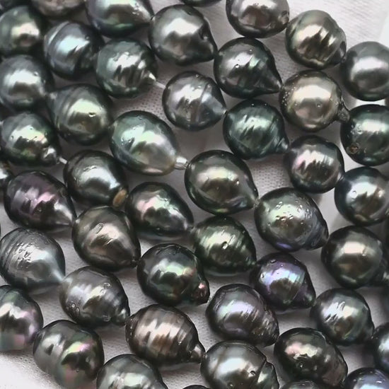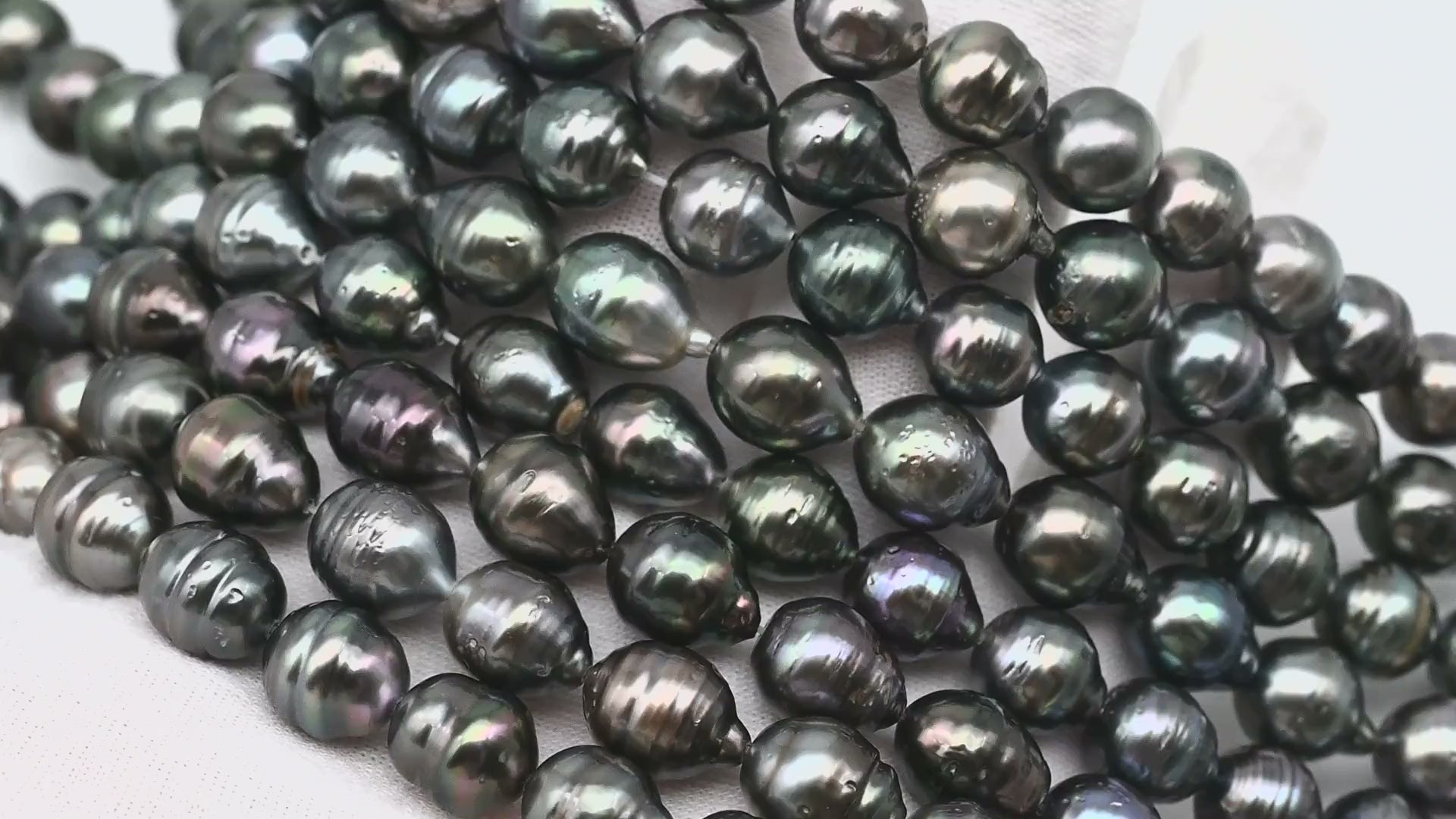Tahitian pearls temporarily strung in full strands, perfect for restringing and knotting to make a beautiful necklace or breaking up to create your own jewelry designs. These gems feature high luster with natural blemishes on the surface and beautiful natural colors.
