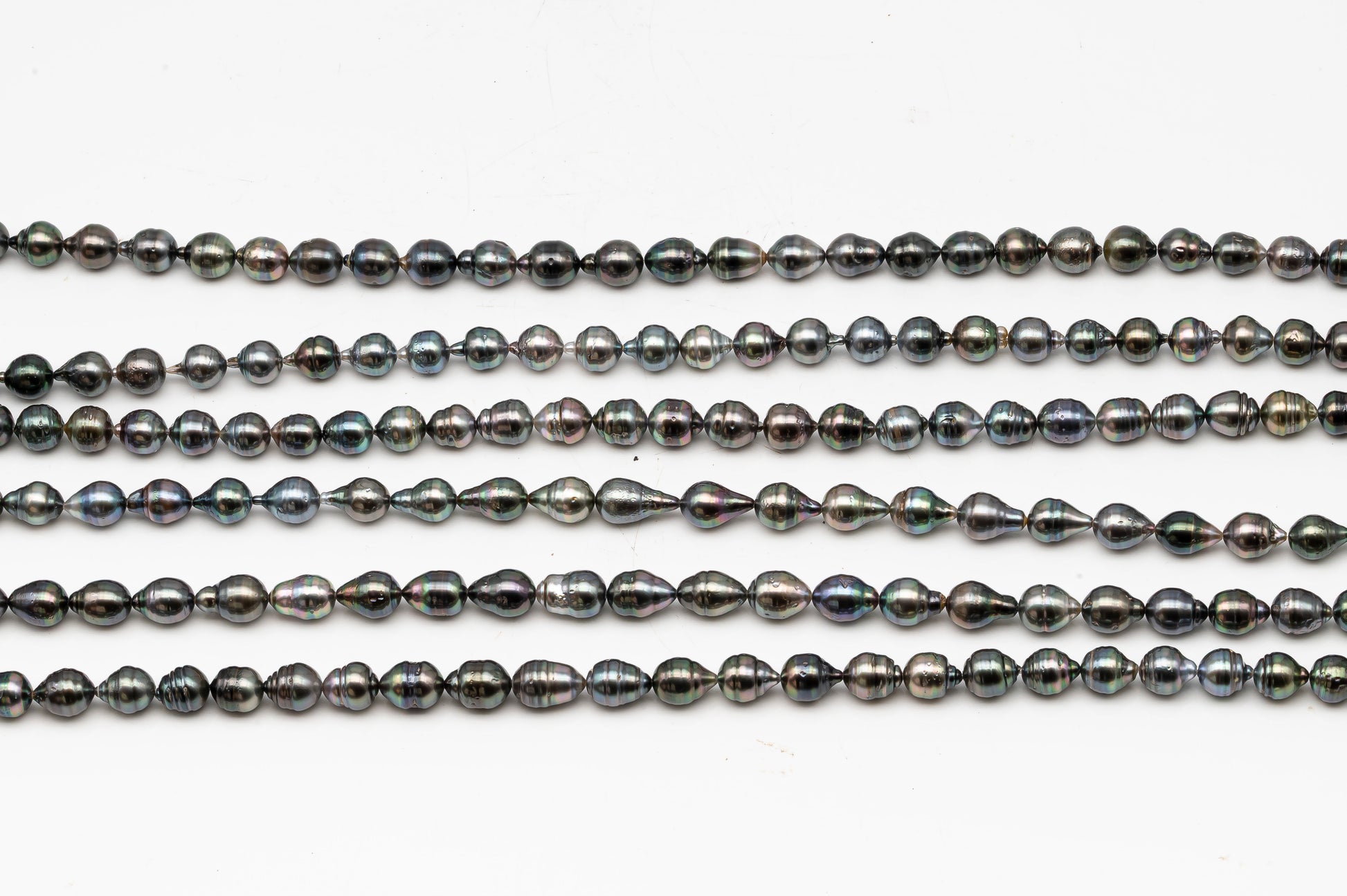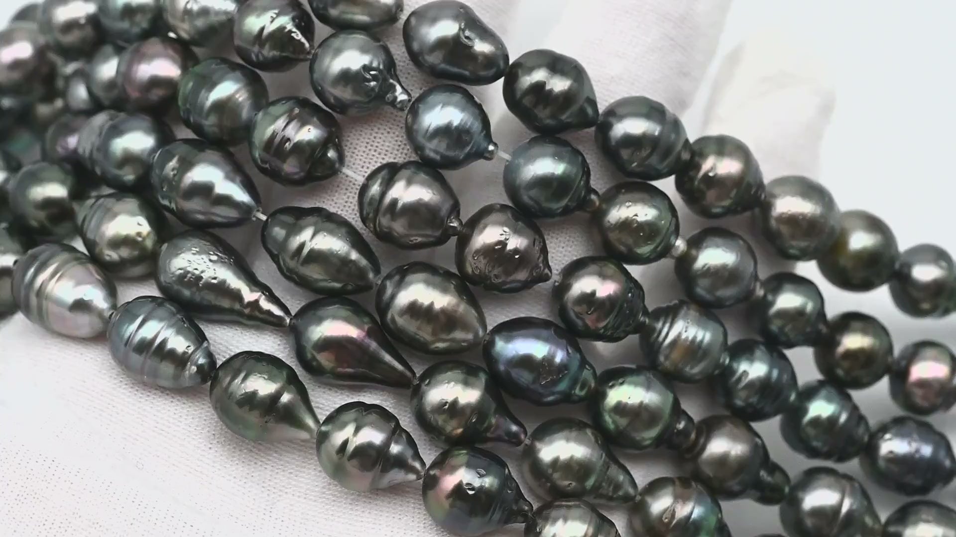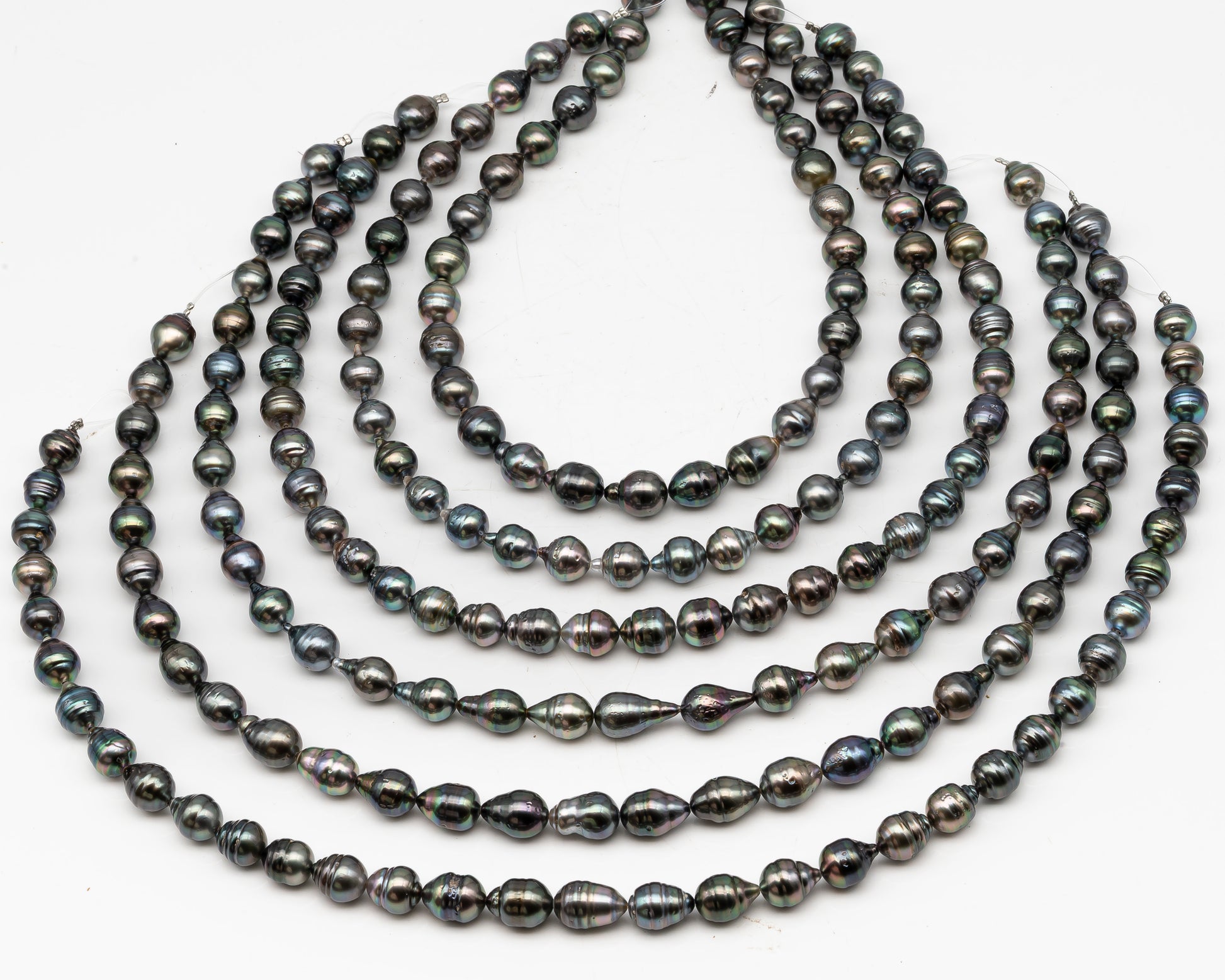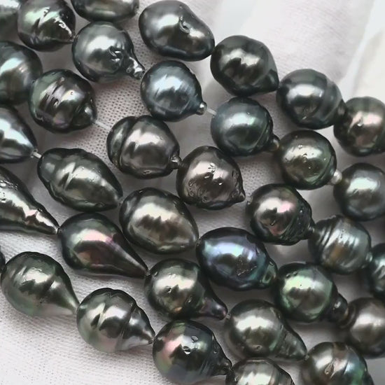 Tahitian pearls temporarily strung in full strands, perfect for restringing and knotting to make a beautiful necklace or breaking up to create your own jewelry designs. These gems feature high luster with natural blemishes on the surface and beautiful natural colors.